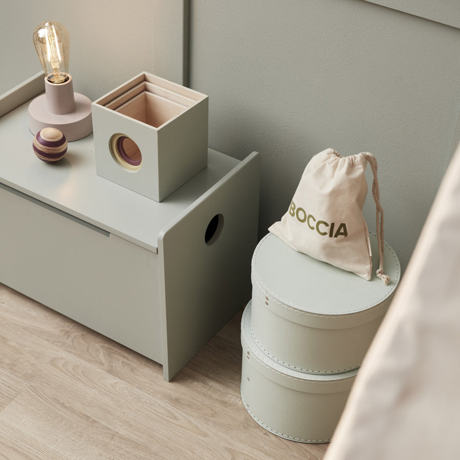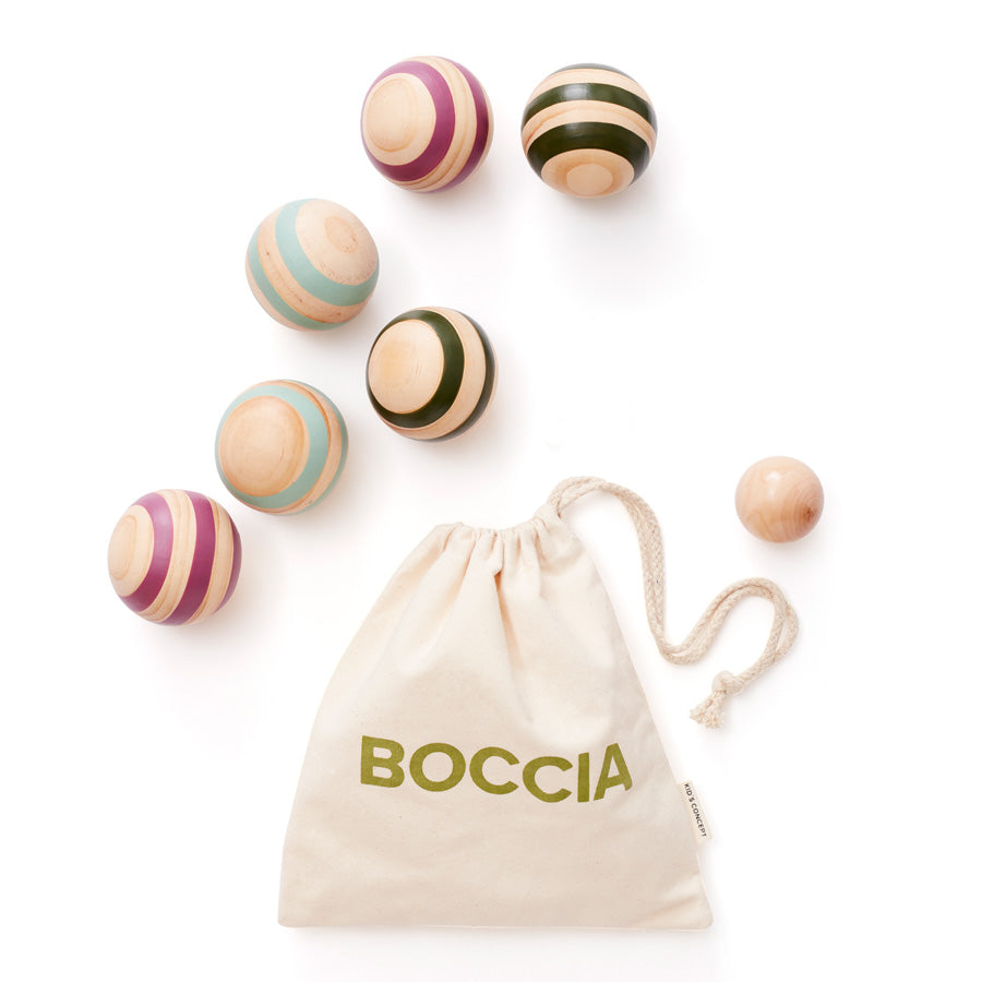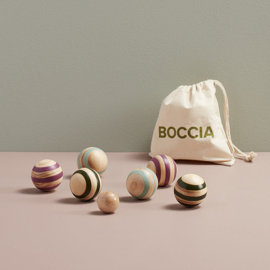 Das Boccia-Set in Farben die an den Stil der 70er Jahre erinnern ist aus Pinienholz gefertigt. Die Wurfkugel hat einen Durchmesser von 6 cm und die Zielkugel 4cm. Ein Säckchen um das Spiel aufzubewahren ist mit dabei!
