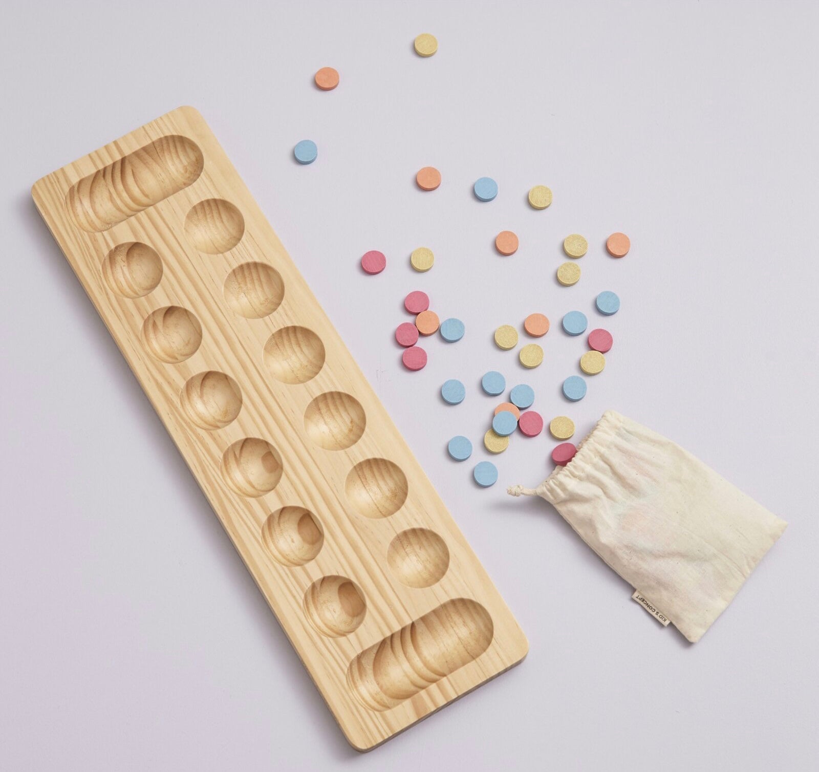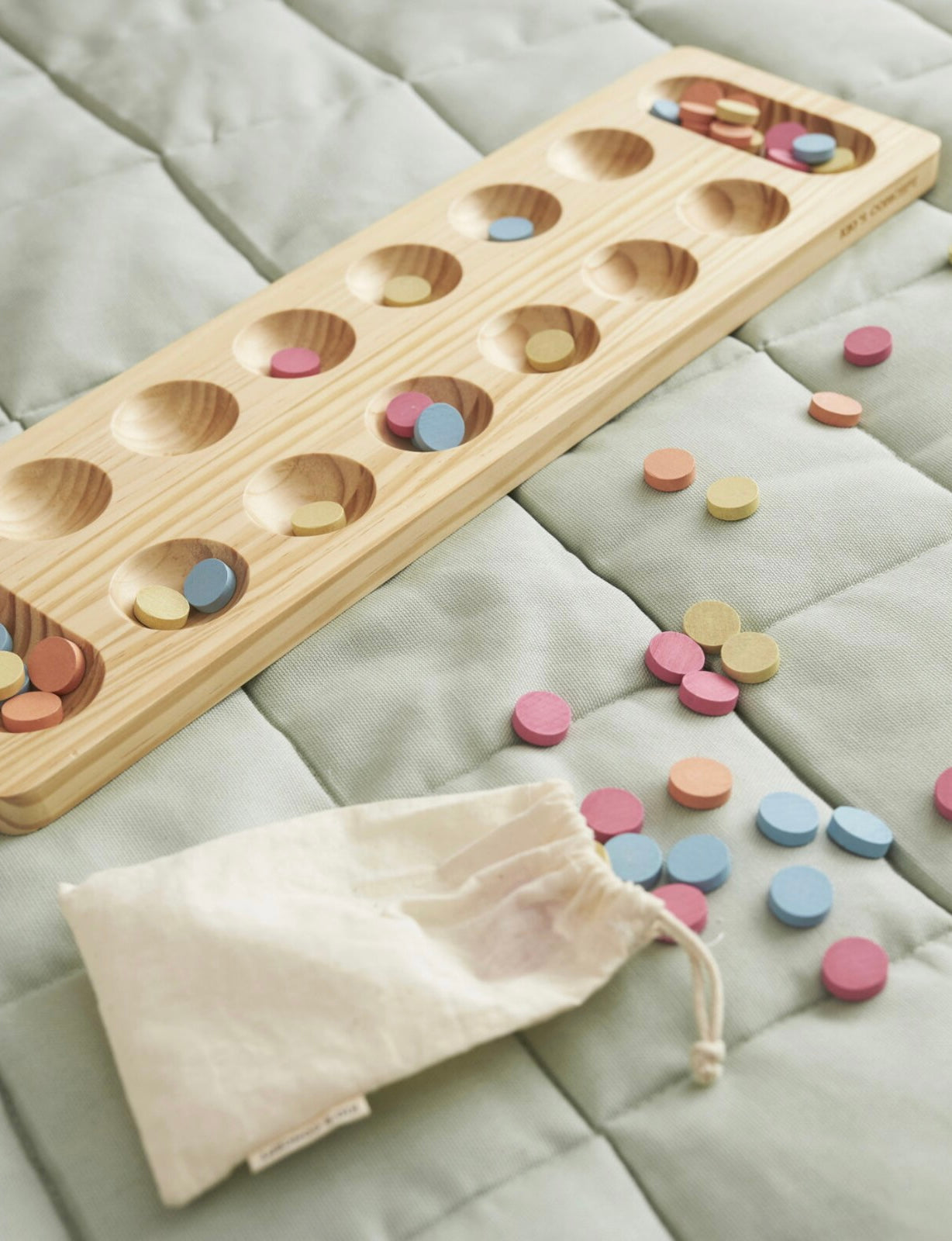 Das Spiel 'Kalaha' gibt es seit mehr als 500 Jahren und ist bei Erwachsenen und Kindern gleichermaßen beliebt. Das Spiel ist für zwei Personen und jeder Spieler hat sechs Mulden vor sich. In jede Mulde werden zunächst sechs Steine gelegt. Jetzt müssen die Steine aus einer Mulde gegen den Uhrzeigersinn auf die nächsten Mulden des Spielbretts verteilt werden, und zwar immer nur ein Stein pro Mulde. Dabei darf die eigene 'Kalaha' - die große Mulde am linken und rechten Rand - gefüllt werden, die Gegner Kalaha wird ausgelassen. Es wird abwechselnd gezogen und die Spielsteine wandern von Mulde zu Mulde weiter. Es ist Taktik und Geschick gefragt, denn bloßes Schieben der Steine reicht nicht aus. Ziel des Spiels ist es, wer am Ende die meisten Steine in seiner Kalaha gesammelt hat. Das Spiel ist beendet, wenn alle Mulden eines Spielers leer sind. Die Spielsteine werden in einem Bauwollsäckchen aufbewahrt. Das Spiel besteht aus 50 Teilen.