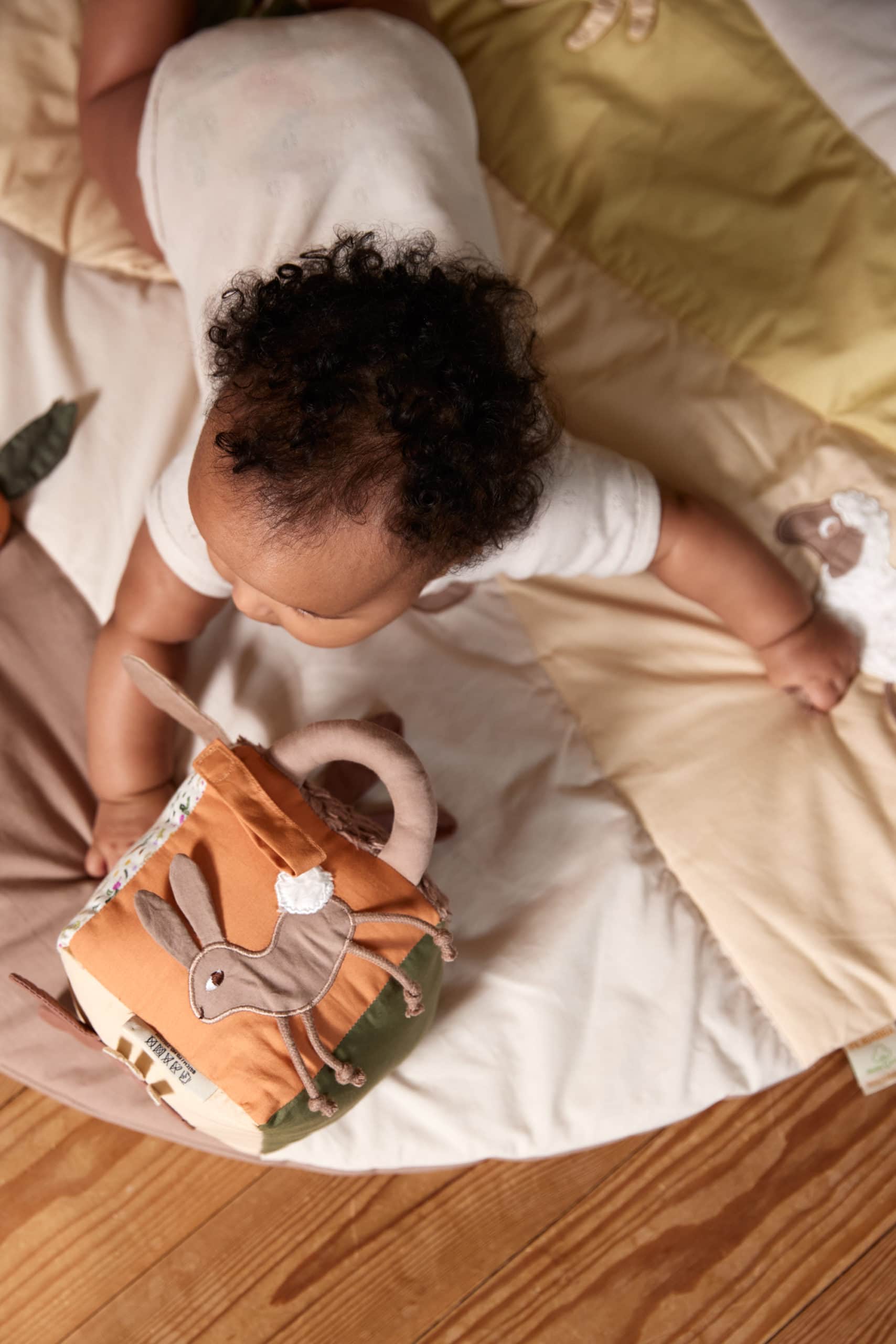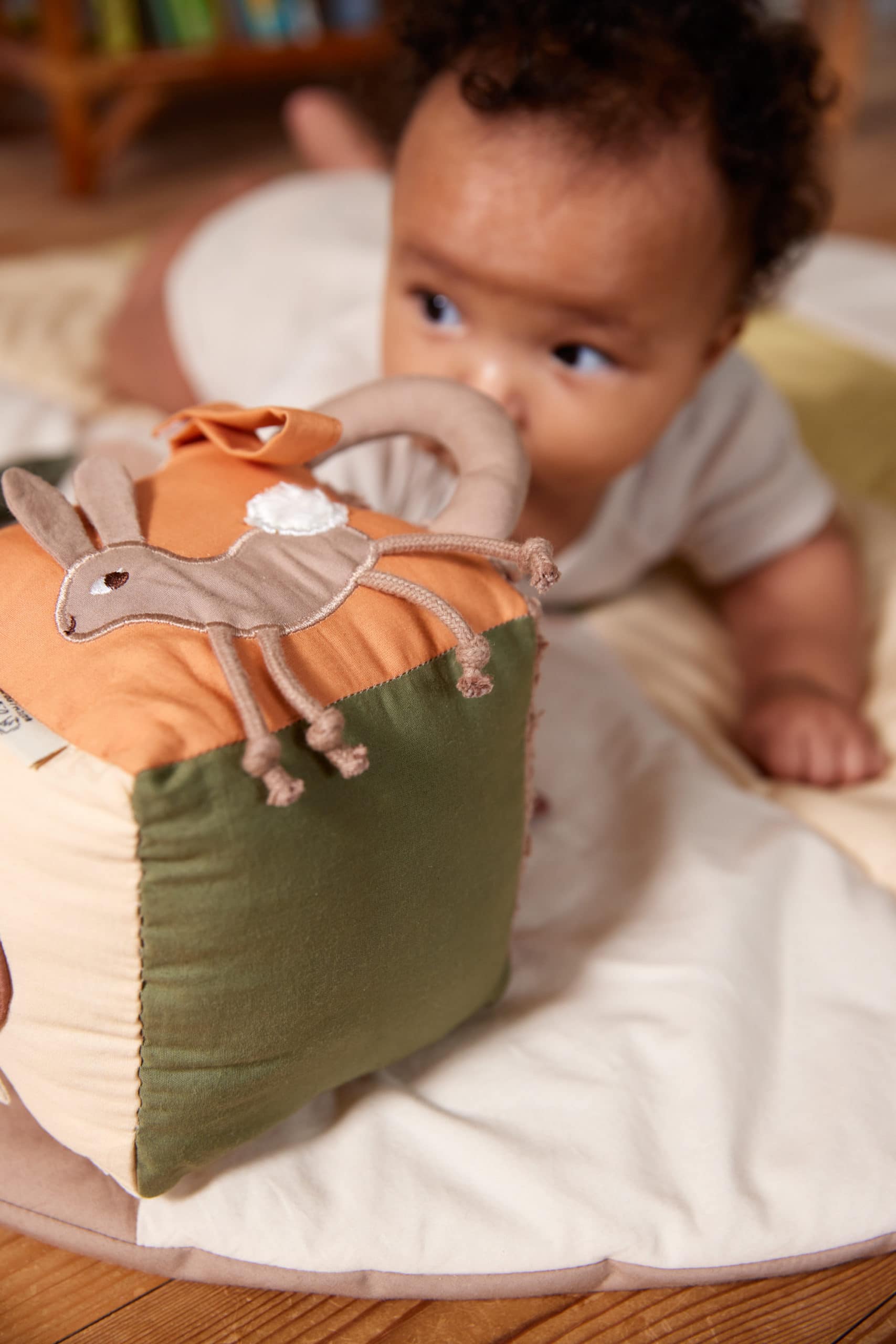 Der Würfel ist vollgepackt mit anregenden Details wie Spiegel, Glocke, Illustrationen, Knistergeräuschen, Schnüren und Stoffen, so dass es für kleine Hände viel zu entdecken gibt.