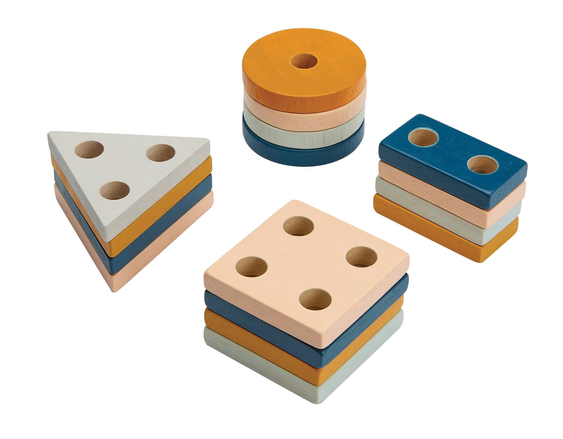 Ein Set aus verschiedenen geometrischen Formen, die auf einem Steckbrett auf die richtigen Plätze gesteckt und gestapelt werden müssen: Kreis, Dreieck, Rechteck und Quadrat. Dabei lernen die Kinder ganz spielerisch etwas über Farben und Formen. Zusätzlich wird die Feinmotorik gefördert.
