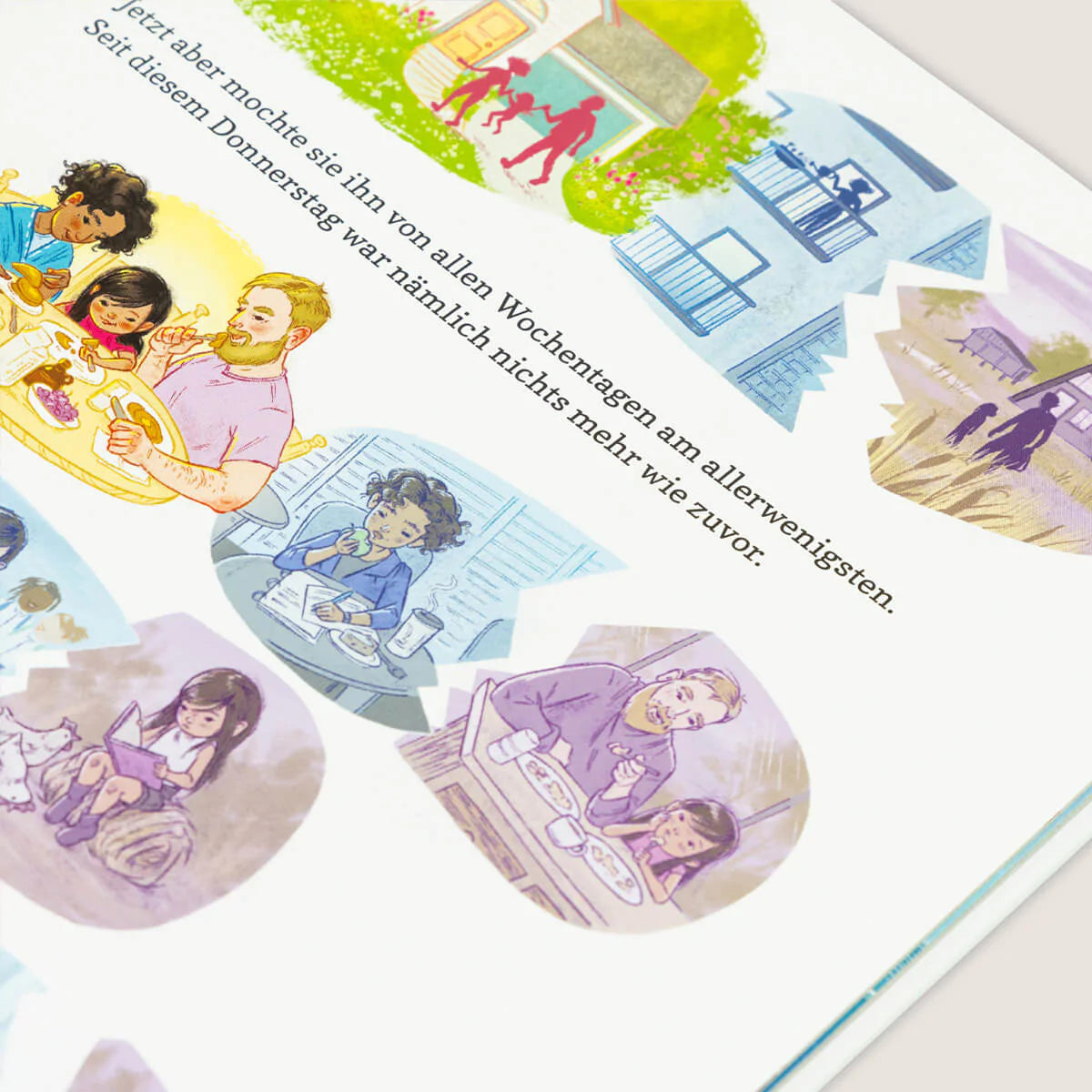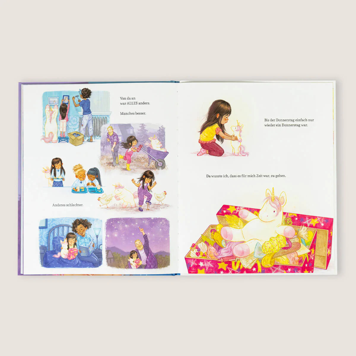 Die schlechte Nachricht kam an einem Donnerstag: Ihre Eltern würden sich scheiden lassen. Und so wurde aus dem Lieblingstag der schlimmste Wochentag überhaupt. Denn alles lief auf einmal anders. Zum Glück steht dem kleinen Mädchen in dieser schweren Zeit ein guter Freund zur Seite. Das kuschelige Einhorn kann aufmuntern, Trost spenden oder einfach nur da sein. Bis irgendwann Donnerstag wieder ein ganz normaler Tag in der Woche sein kann. Ann Bonwill gibt einen Einblick in die Gefühlswelt von Kindern, deren Eltern sich trennen, und zeigt, wie man diesen Trennungsschmerz mit der Kraft der Freundschaft überwinden kann. Eine feinfühlig und sensibel erzählte Freundschaftsgeschichte, die Trost spendet und Hoffnung schenkt. Ein Bilderbuch über Scheidung: Veränderungen mit der Kraft der Freundschaft begegnen Wenn Eltern sich trennen, bricht auf einmal eine kleine Welt zusammen. Der Alltag ist anders, ein Umzug steht an: In dieser Zeit hilft das Plüsch-Einhorn nicht nur, die Trennung zu verarbeiten, sondern auch, wieder Freude und Zuversicht zu empfinden. „Donnerstag“ ist eine sensible Geschichte darüber, wie es Kindern gelingt, Trennungsschmerzen zu überwinden und neu Vertrauen zu fassen!