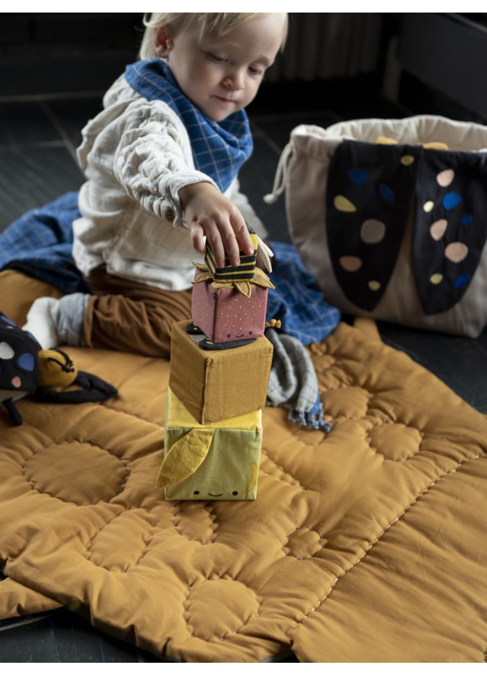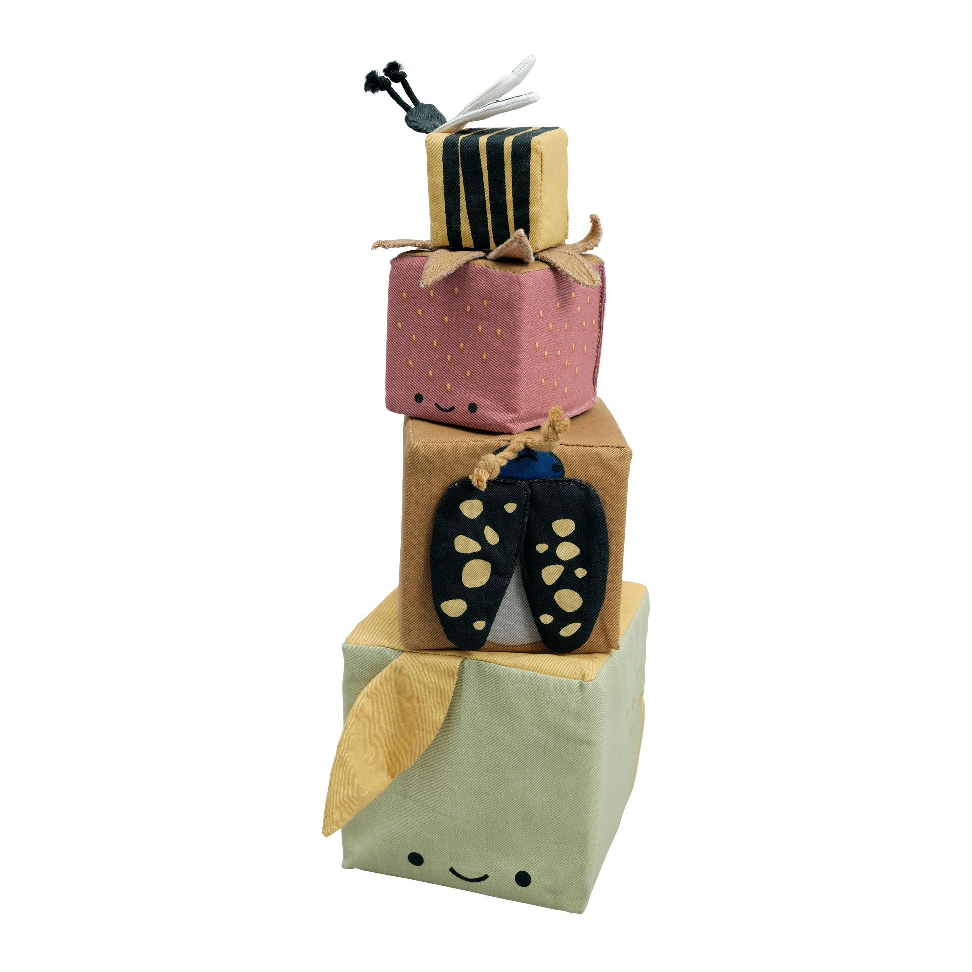 Zuckersüßer Stapelturm 'Soft Blocks Orchard' von Fabelab für die Kleinsten zum Entdecken, Greifen und Spielen. Die vier weichen Stoff-Würfel bestehen aus einem Apfel, einem Käfer, einer Erdbeere und einer Biene – alle mit unterschiedlichen Farben und vielen liebevollen Details, die den Seh-, Tast- und Hörsinn Ihres Kleinen stimulieren.