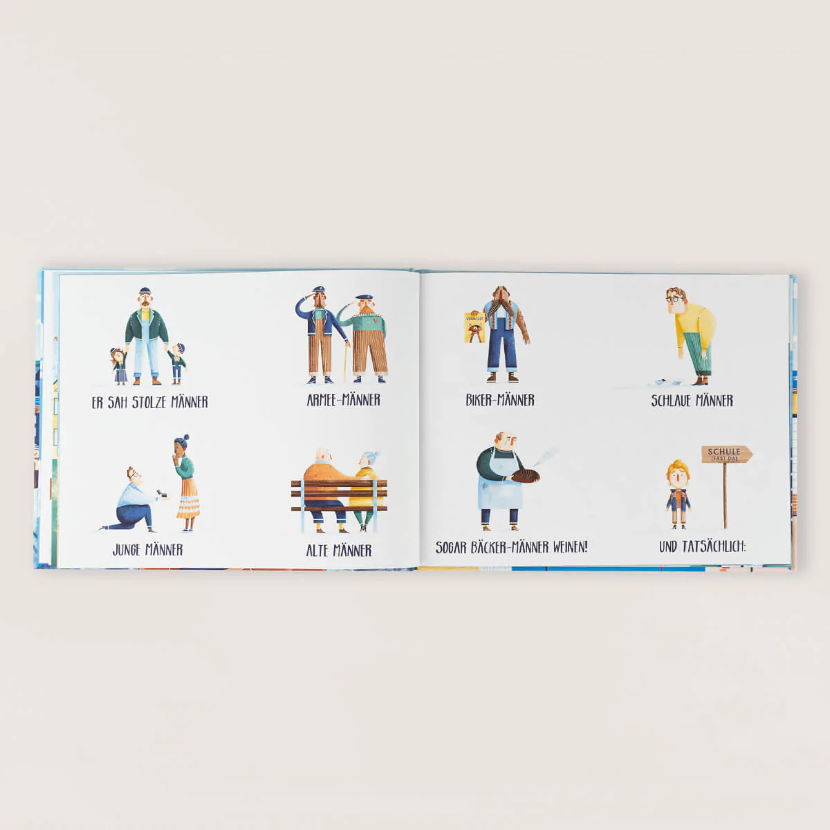 Vor seinem ersten Tag an einer neuen Schule ist Levi ganz mulmig zumute. Da sagt sein Papa in seiner Hilflosigkeit: „Männer weinen nicht!” Doch auf seinem Schulweg beobachtet Levi überall Männer, die ihren Gefühlen freien Lauf lassen. Dieses wundervolle Kinderbuch zeigt unseren Kindern, dass es gesund, wichtig und ganz normal ist, Emotionen, Angst und Verletzungen zu zeigen. Mit spektakulären Illustrationen in wunderbaren Pastelltönen ist „Männer weinen” ein kleines Meisterwerk. „Die Zeit war reif für so ein Kinderbuch. In einer Gesellschaft, in der Männer ihre Gefühle oft verstecken sollen, ist es so erfrischend ein Buch zu finden, das sich an die Kleinsten richtet und ihnen sagt: Du und deine Gefühle sind genau so in Ordnung.”