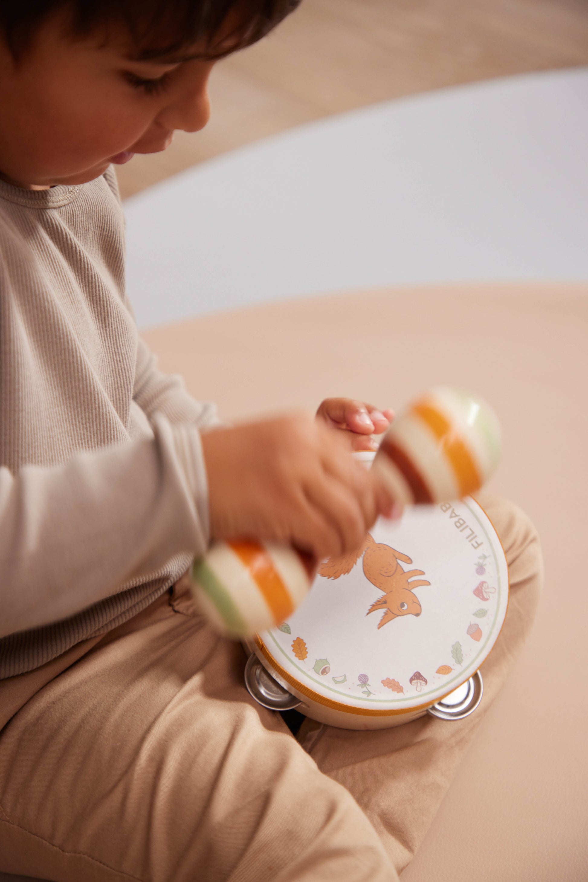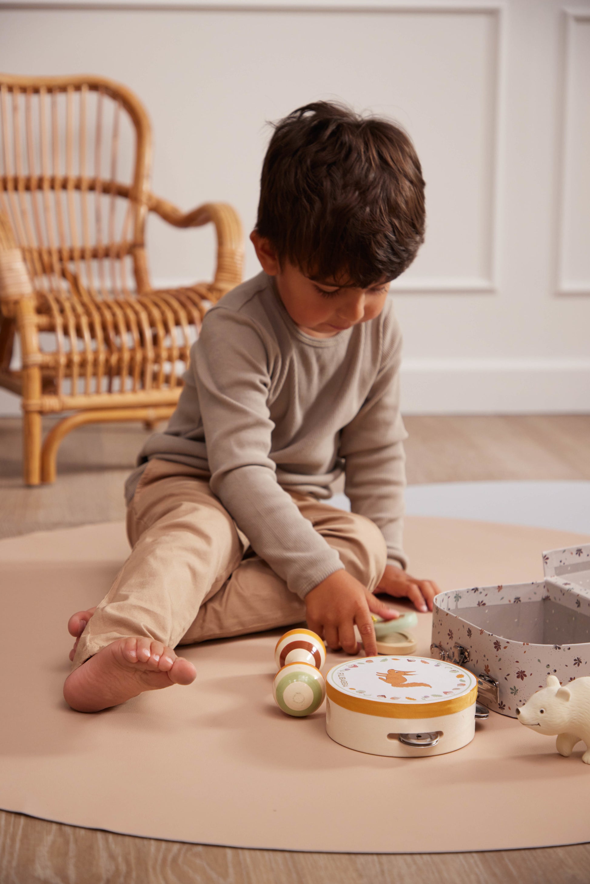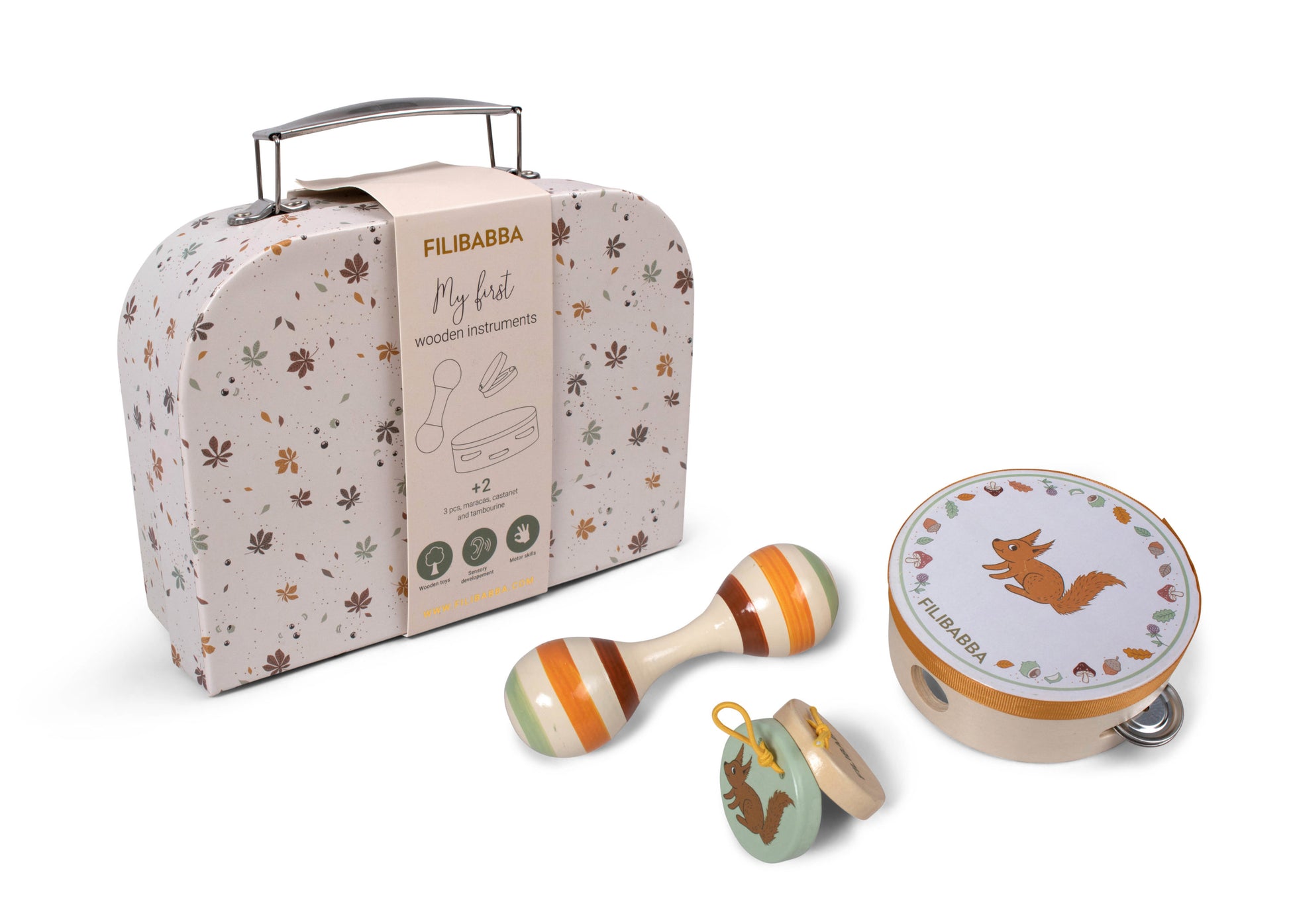 Lass uns gemeinsam Musik machen! Mit diesem niedlichen Spielzeugkoffer mit Instrumenten kann Dein Kind Klänge und Rhythmen erkunden und gleichzeitig seine feinmotorischen Fähigkeiten entwickeln. Der Koffer enthält drei Instrumente: Kastagnetten, Maracas und Tamburin. Die Instrumente sind entweder aus Pappel- oder Buchenholz gefertigt und mit niedlichen Illustrationen von Eichhörnchen und Elementen aus der Natur verziert. Die Außenseite des Koffers ist mit den bunten Blättern unseres Chestnuts-Prints. Mit dem praktischen Koffer lässt sich das Set leicht auf Reisen mitnehmen und nach dem Konzert schnell aufräumen. Material: Papier und Holz Höhe (cm) 4 Breite (cm) 12 Länge (cm) 12 Nettogewicht (Gram) 328