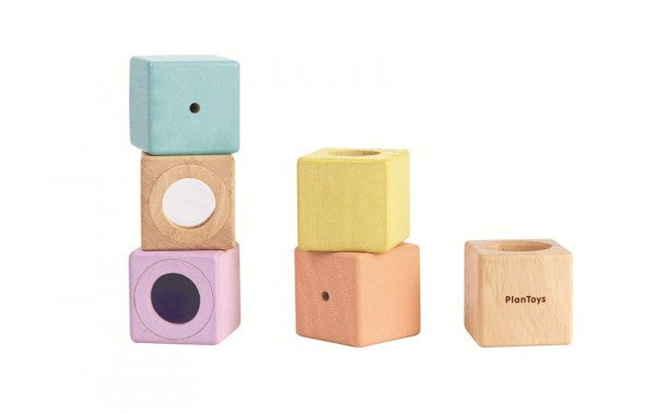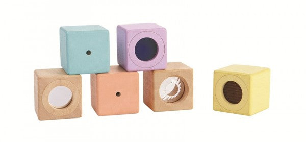 Das Set aus sechs Sinnesblöcken besteht aus zwei visuellen Blöcken, zwei Hörblöcken und zwei Texturblöcken. Durch die Stimulation der verschiedenen Sinne wie Sehen, Fühlen und Hören wird die Ausbildung der Sensorik gefördert.