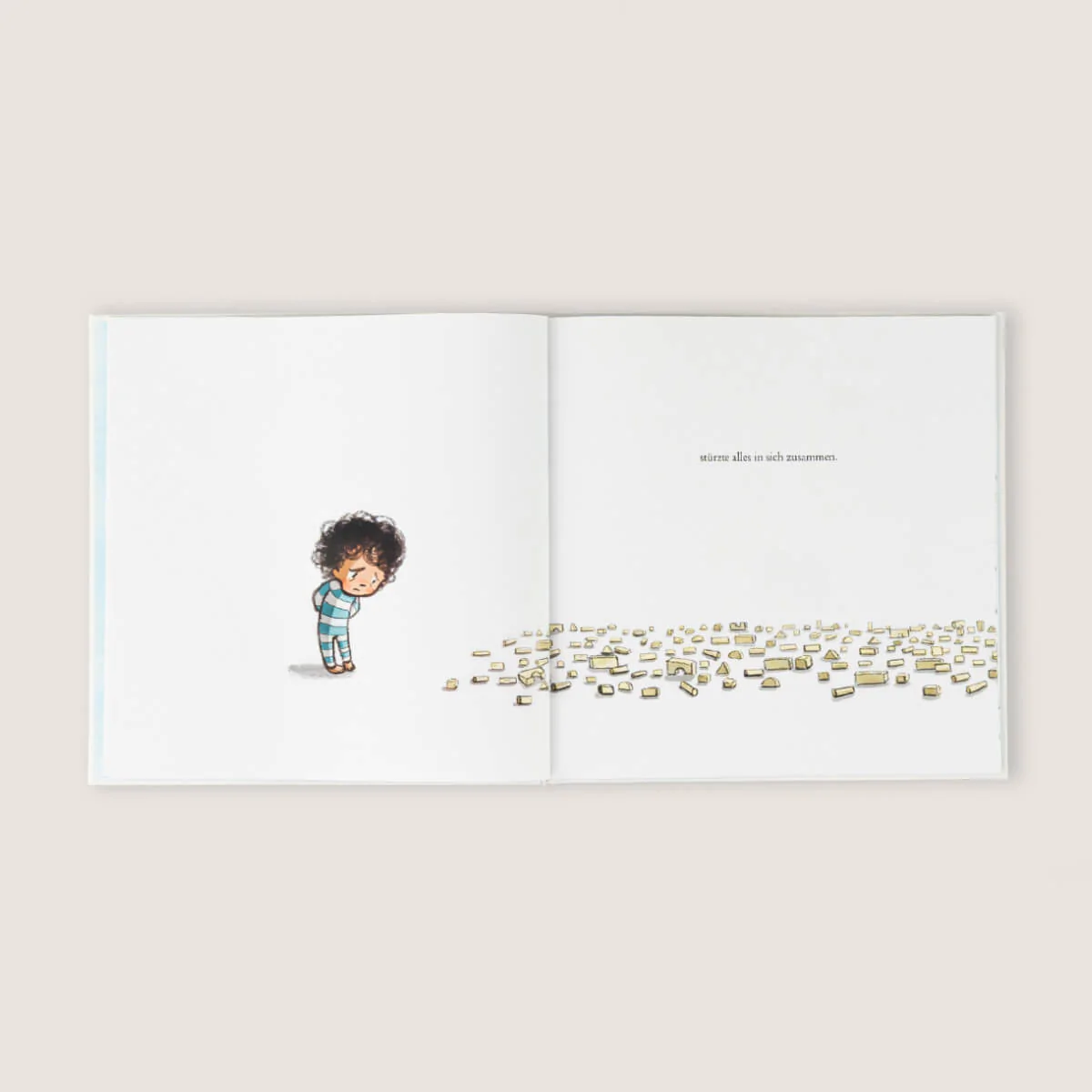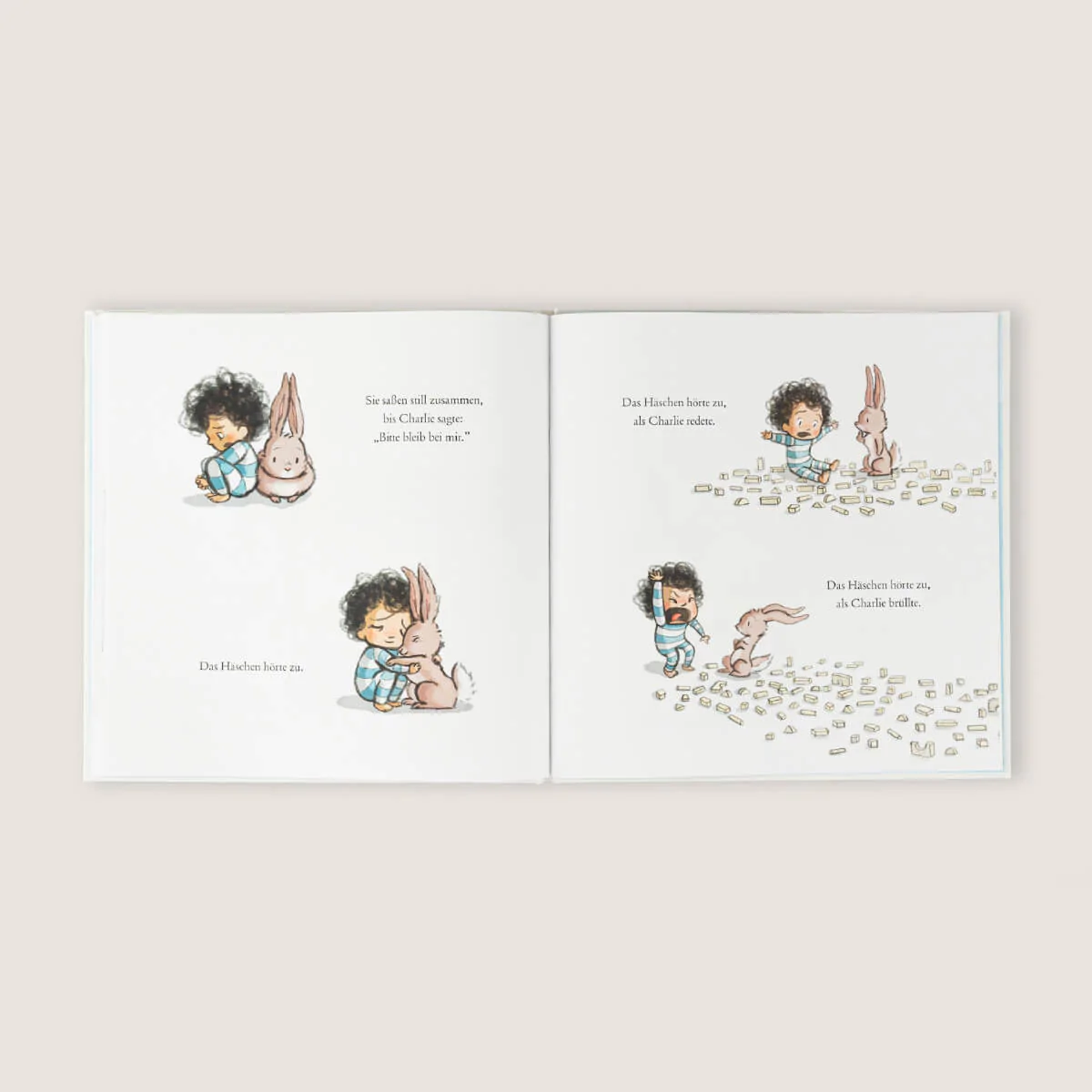 Charlie baut einen Turm aus Bauklötzen, doch plötzlich stürzt er ein! Oh weh! Ein Freund nach dem anderen probiert das Kind aufzumuntern, doch nichts hilft. Bis ein kleiner Hase auftaucht und sich still dazu setzt – und Charlie all die Gedanken und Gefühle ordnen kann...