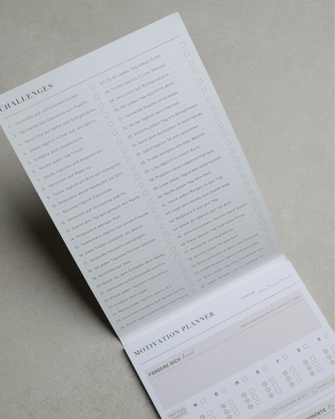 Motivation Planner – sei mutig und motiviert Der Motivationsplaner ist dein Partner für ein motiviertes Mindset. Du lernst, dir neue Ziele zu setzen und schaust jeden Tag ein Stückchen mehr über den Tellerrand. Die Energie, die du dadurch gewinnst, kannst du für deine persönlichen Projekte nutzen. Sei gespannt, was du alles erreichen kannst. Alles was es braucht, ist der erste Schritt, um anzufangen. Unser Erfolgsjournal hilft dir dabei.