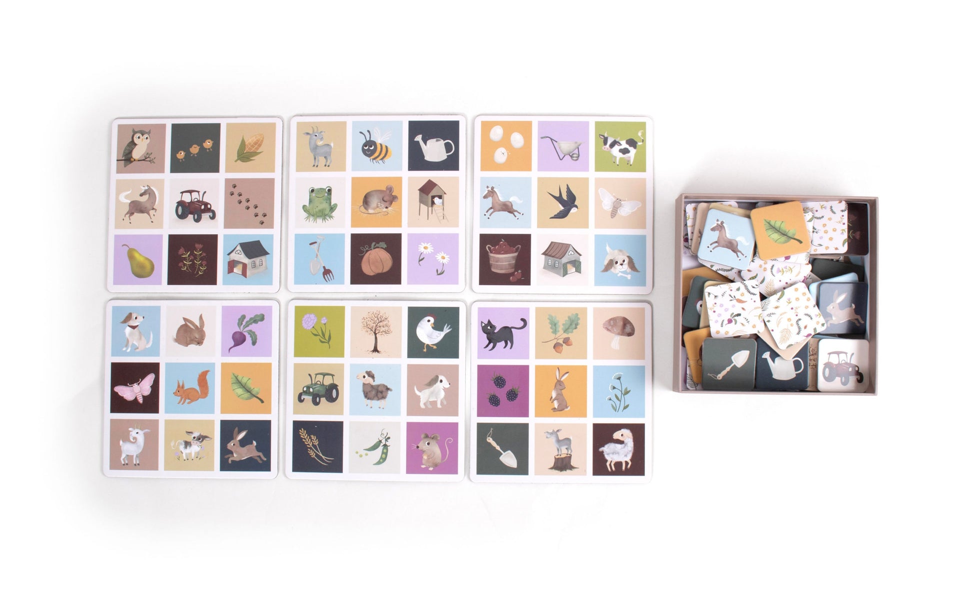 Das Bauernhof-Lotto enthält 6 Spielbretter und 54 Spielsteine mit farbenfrohen, handgezeichneten Illustrationen, die niedliche Tiere und beliebte Elemente aus dem Landleben darstellen.