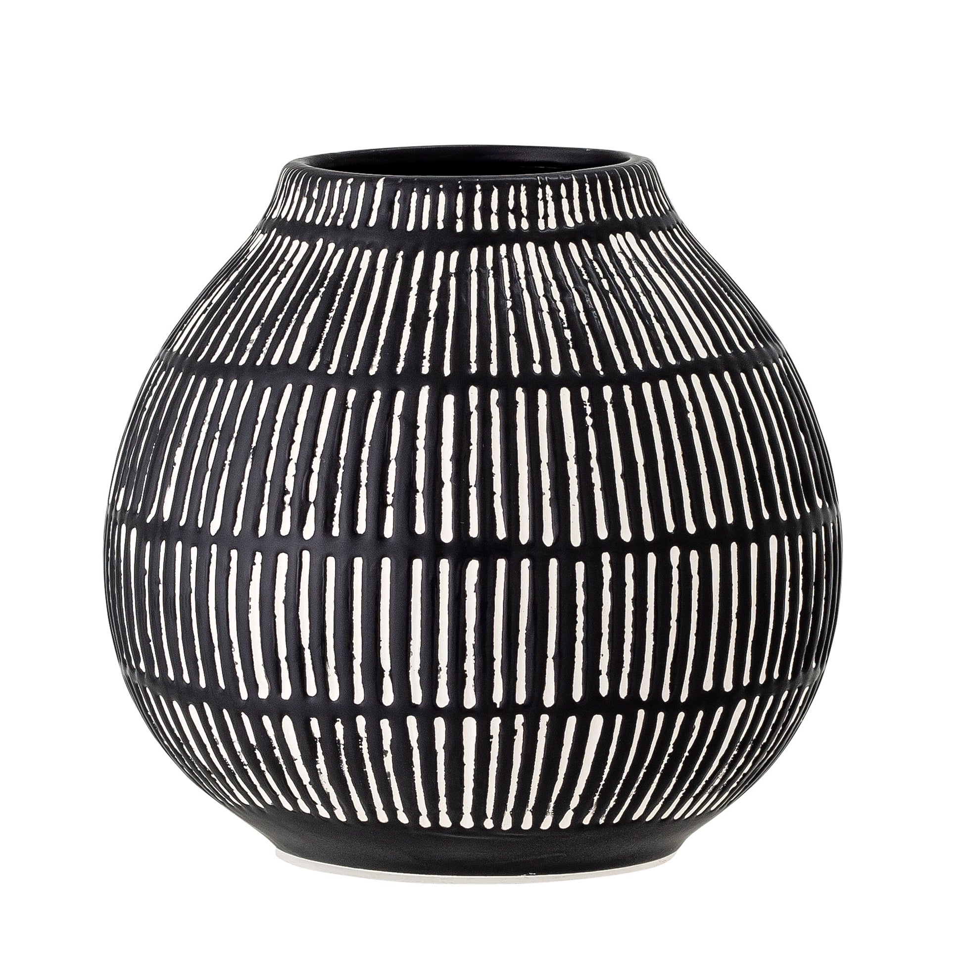 Bloomingville – Eine mittelgroße runde Vase, die fast so hoch wie breit ist. Es besteht aus schwarzem Steinzeug mit einem kontrastierenden weißen Streifenmuster an den Seiten. Das breite Profil dieser Vase und die große Öffnung machen sie zu einer perfekten Ergänzung für einen niedrigen und breiten Blumenstrauß. Aber auch ohne Blumen oder Pflanzen ist er dekorativ genug, um auf dem Tisch, auf der Fensterbank oder im Regal zu stehen.