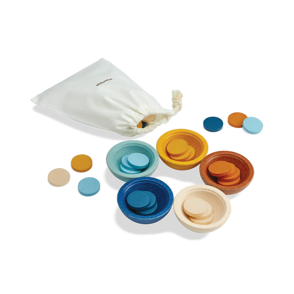 Achtung! Nicht geeignet für Kinder unter 18 Monate. Sortiere die Chips nach Farbe in die Schüsseln. Dieses Spiel hilft die Farberkennung und grundlegende Zähl- und Sortierfähigkeiten zu entwickeln. Die Feinmotorik und die Hand-Auge-Koordination wird auch geschult. Dieses Set enthält fünf farbige Holzschüsseln, passend zu den Holzchips, die in einem mitgelieferten Baumwollbeutel aufbewahrt werden können.